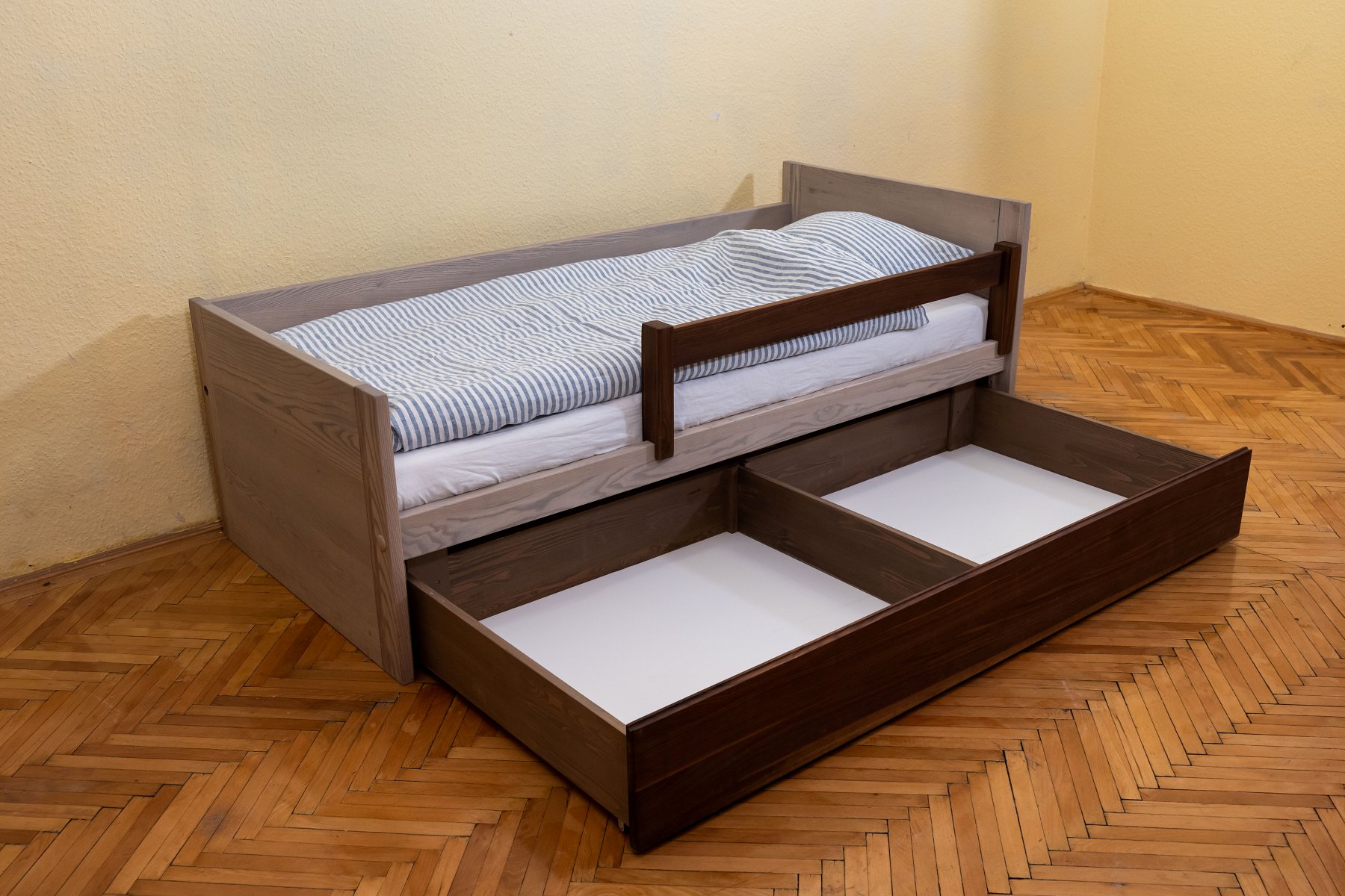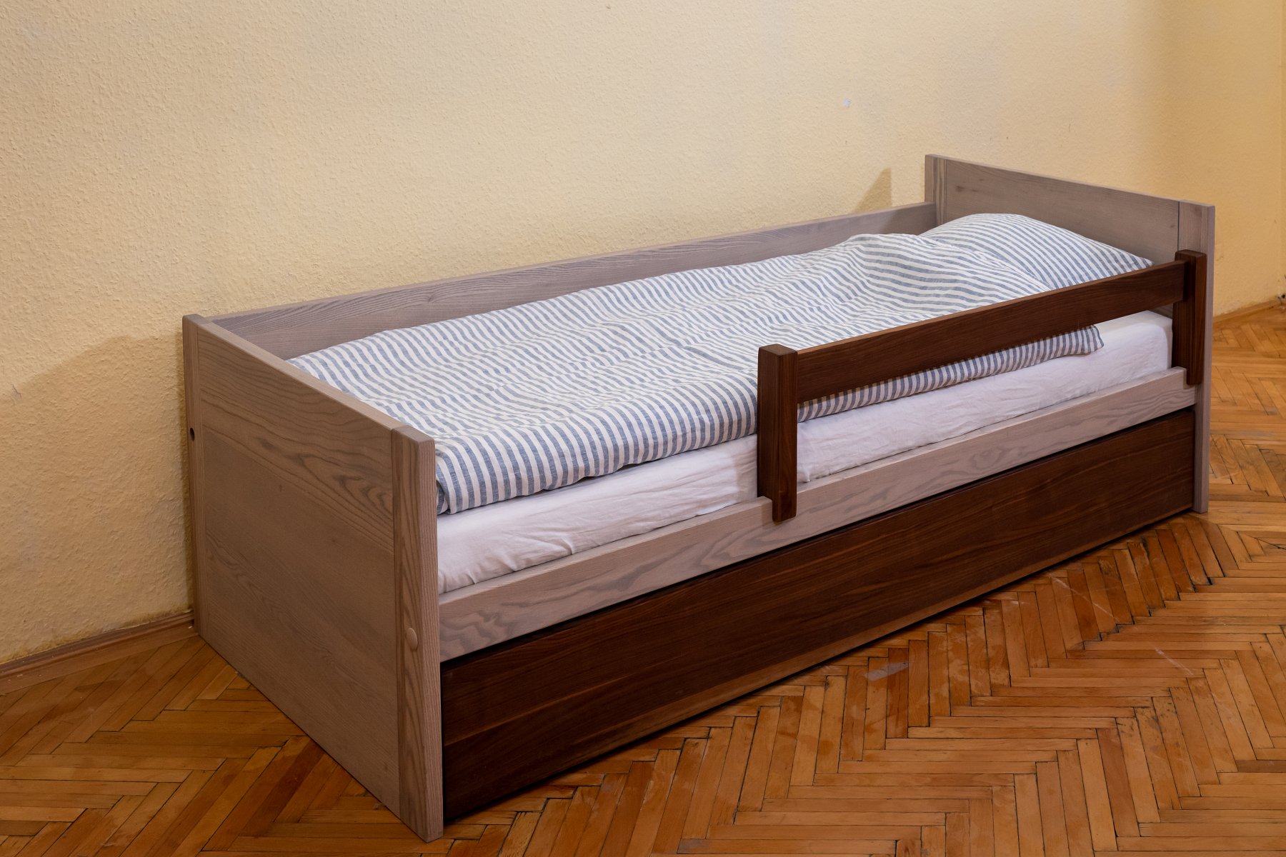 A modern vonalvezetésű otthonok gyerekágya. Masszív minimalista darab, de az éleket annyira legömbölyítettük, hogy sérülést nem okoznak. Fenyőfából nem készítjük, inkább félkemény és keményfa-fajtákból.